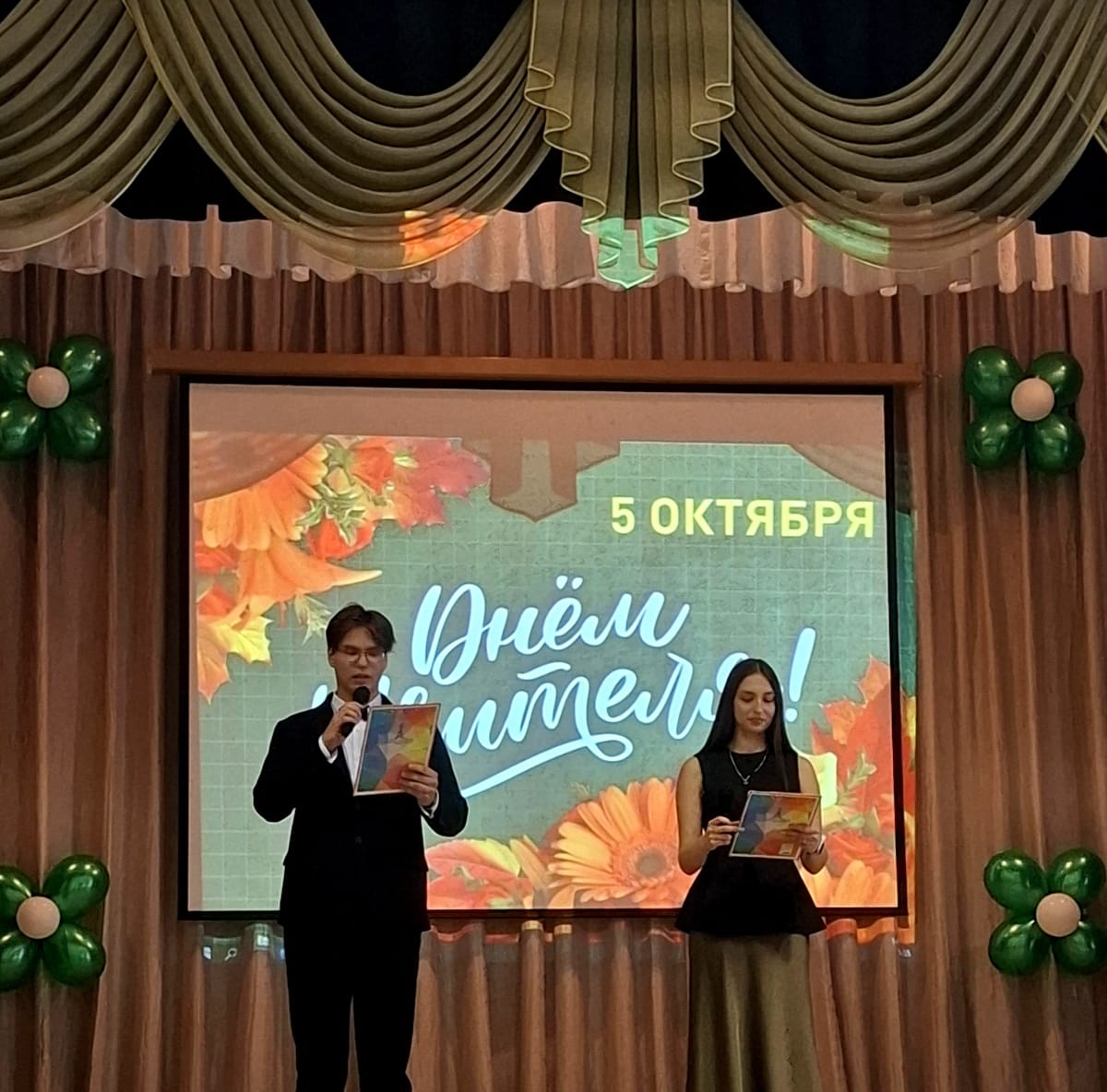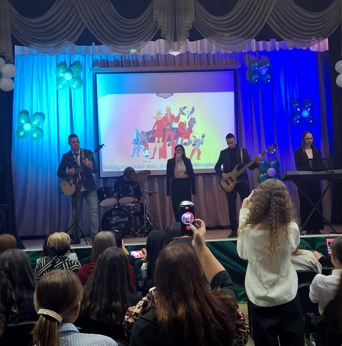 В холле перед актовым залом студентами колледжа была оформлена праздничная зона с поздравлениями преподавателей с Днем учителя.